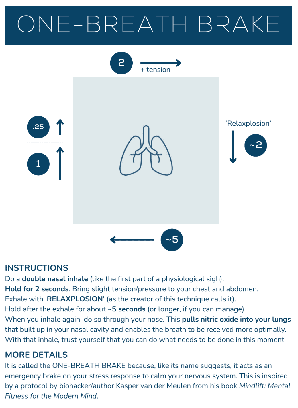 These are your emergency tools. When you feel stress or anxiety rising on the mountain (or in a board meeting), you can use one of these. What is the One-Breath Brake?